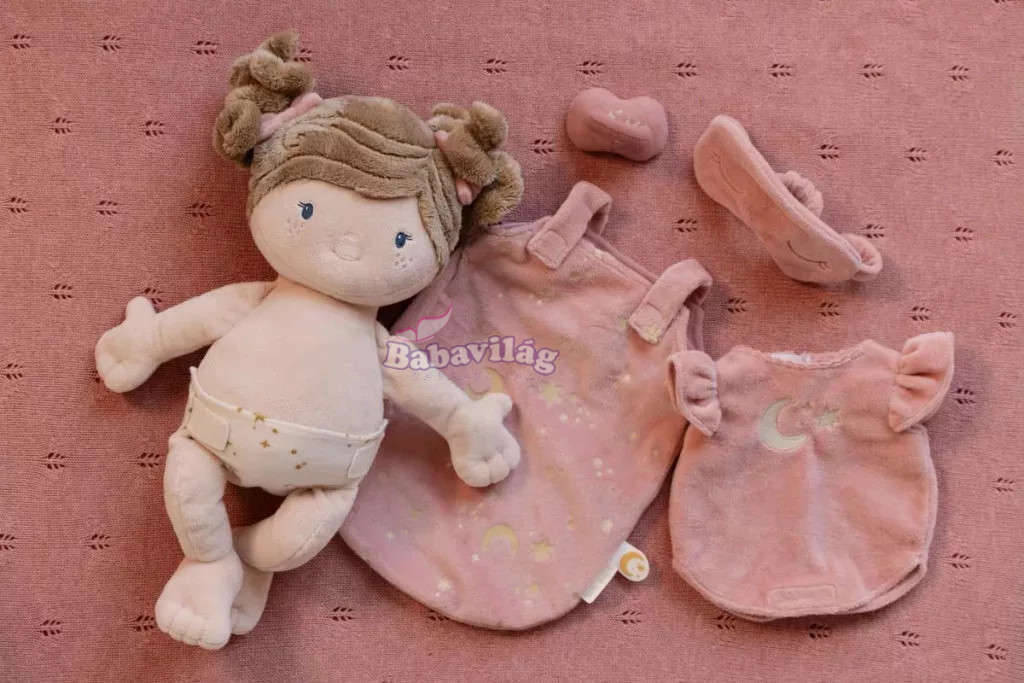 A szett tartalma: Rosa kisbaba, cumi, textil pelenka, hálóruha, hálózsák, alvómaszk