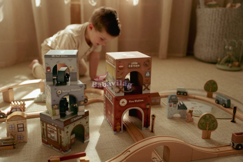 A kockák egymásra rakhatók toronyként, vagy a Little Dutch Train Track XL pálya fölé helyezhetők, hogy az autók könnyedén áthaladjanak alattuk.