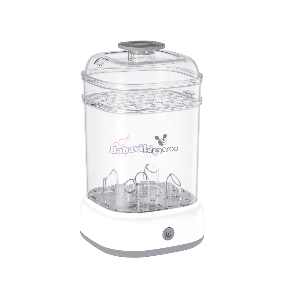 2 rekeszes, a készülékbe 5 normál nyakú vagy 4 széles nyakú cumisüveg fér el. A készlet tartalmaz egy cumisüveg/kiegészítő fogót.
