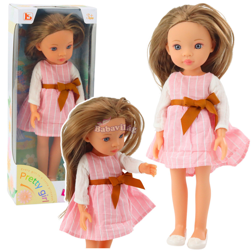 CSINOS LÁNYBABA RÓZSASZÍN CSÍKOS RUHÁBAN 32 CM