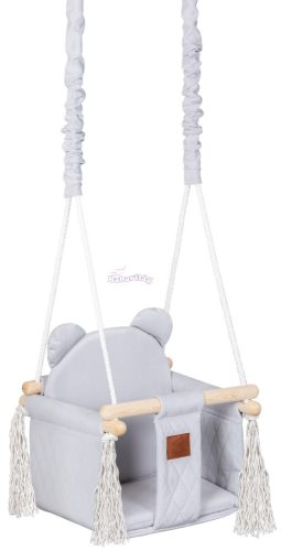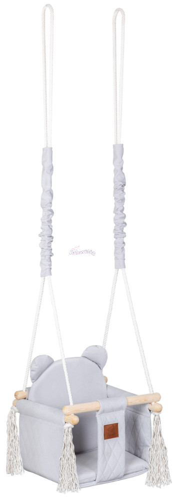 A hinta tartós, vastag, színtelen zsinórokhoz van rögzítve, és boho stílusú rojtokkal/rojtokkal van kiegészítve. A kötelek bársonyból készült dekoratív huzattal vannak ellátva, amelyek még hangulatosabbá teszik a hintát.