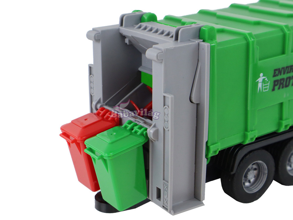 A gyermek felemelheti és leengedheti a konténereket, eljátszva a szemétgyűjtés és -válogatás jeleneteit.