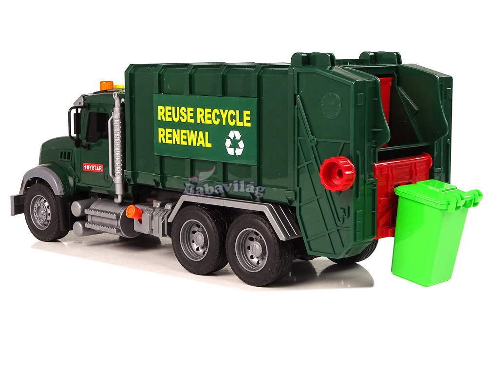 További funkciók, mint például a hang- és fényeffektek, fokozzák a szórakozás élményét és realizmusát. A tetején található figyelmeztető kürtök a mozgásról tájékoztatnak, a tetején található gomb pedig a hangokért felelős - kürt, vödörtöltés, tolatás. A sötétzöld és szürke szín messziről is láthatóvá teszi az autót. A kukásautó hátsó tengellyel rendelkezik, amelyet tolni lehet dörzshajtással, csak nyomd meg a hátulját, engedd el előre, és élvezd a sebességet.