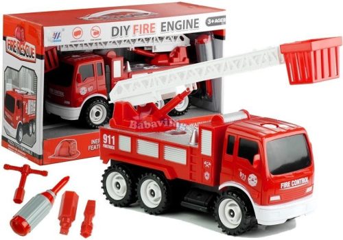 Van benne egy tűzoltóautó, műanyag üléssel, hátrahúzható kerekekkel, valamint egy sor szükséges szerszám a szórakozáshoz.